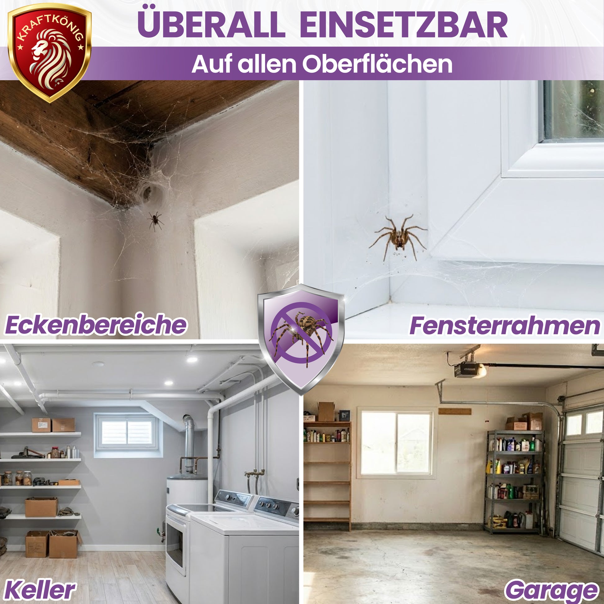 Ob Wohnzimmer, Schlafzimmer, Keller, Garage oder Balkon – Spinnen tauchen überall dort auf, wo sie ideale Bedingungen finden. Das Spinnenspray hilft dir, all diese Bereiche zuverlässig zu sichern und Spinnen fernzuhalten.